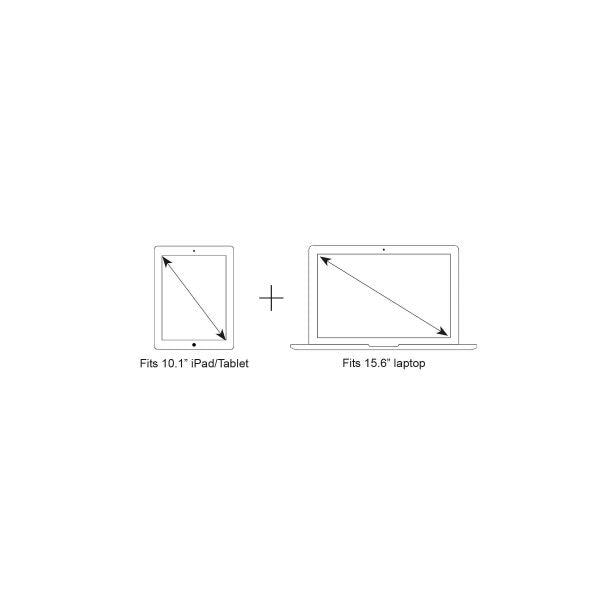 Main zippered fully cell foam padded universal storage compartment including dual 15.6” laptop and 10.1” tablet compartments with Velcro closure